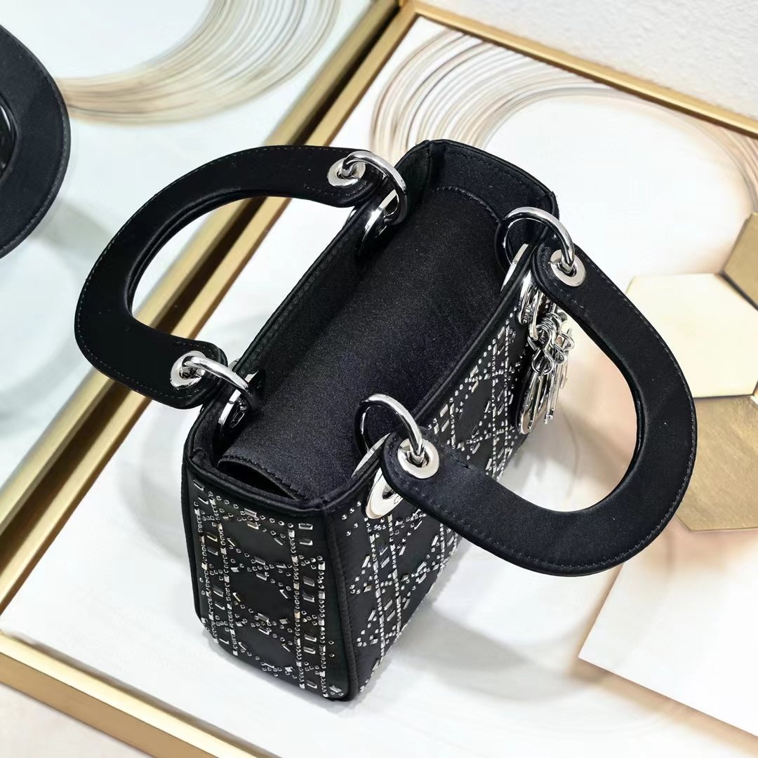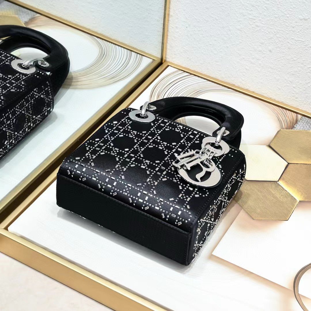 This Lady Dior bag epitomizes Dior’s deep vision of elegance and beauty. Its chic and elegant design is timeless. Crafted from black satin, it is embellished with crystals for a sophisticated evening look. It is embellished with a metal-coated D.I.O.R. charm, adding a touch of agility to the exquisite silhouette. The mini version, with a detachable satin spaghetti strap, can be carried by hand or across the body, making it an ideal companion for evening wear.