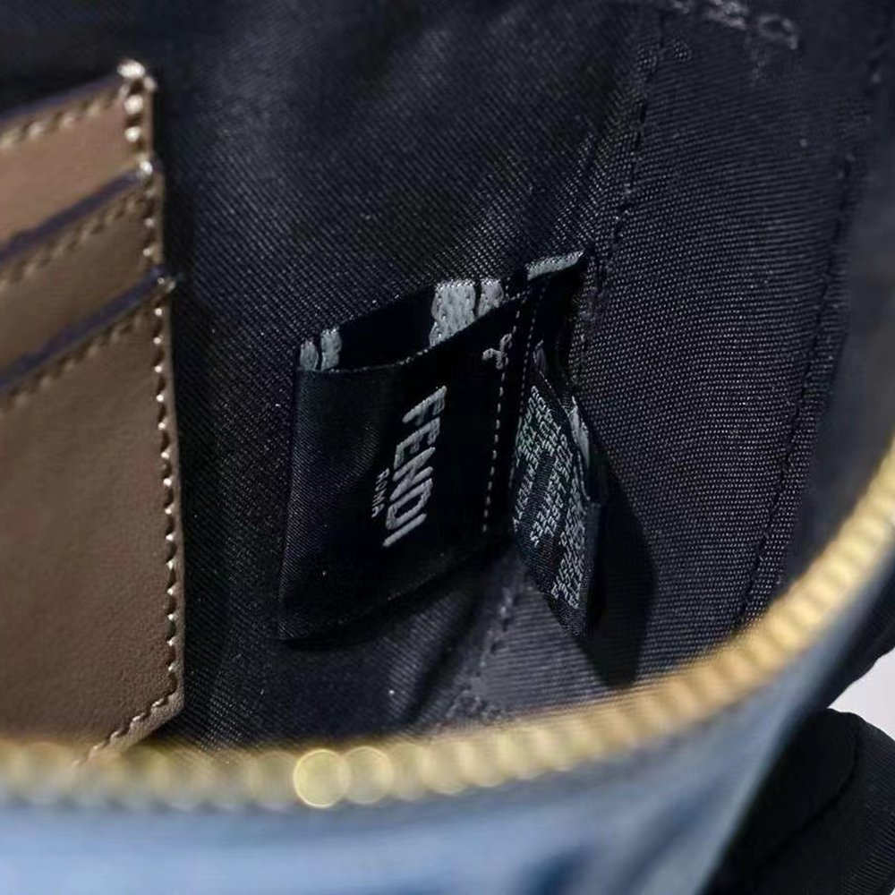 Baguette clutch in light blue denim-effect fabric with FF motif. Zip and pull closure with classic FF motif.
