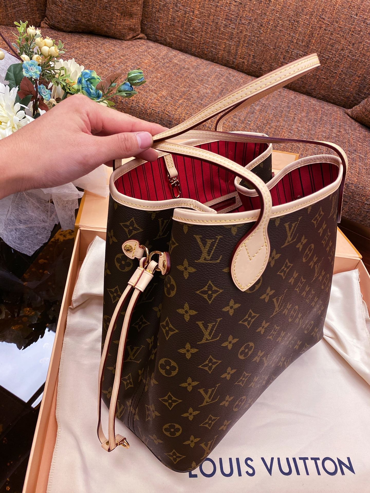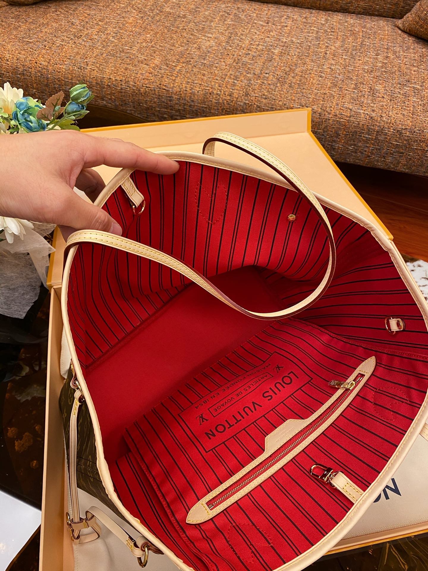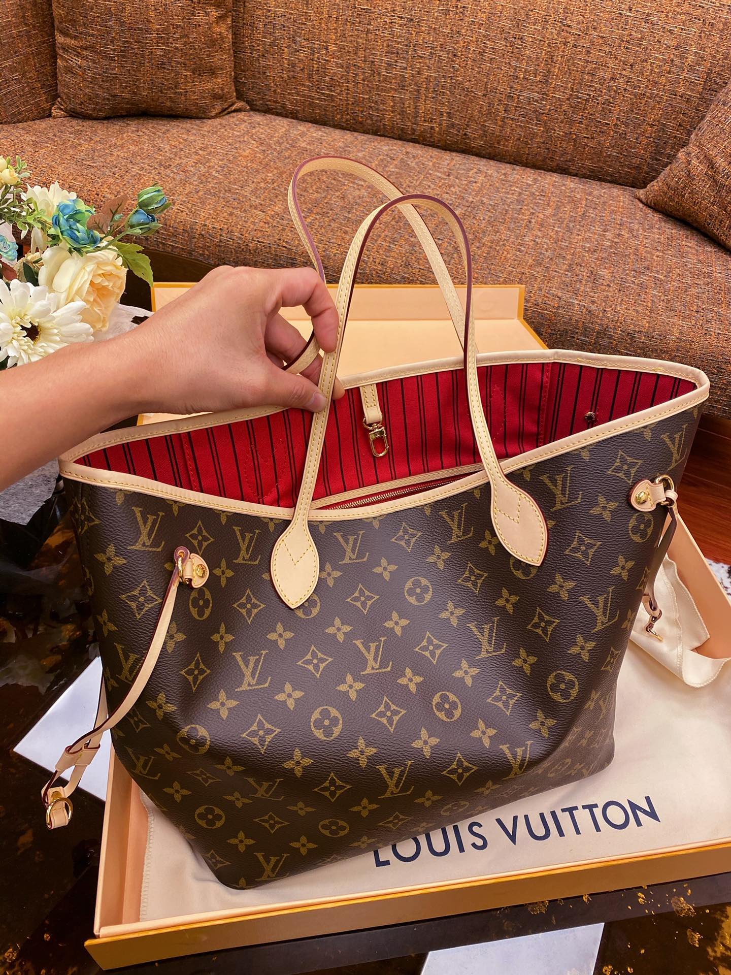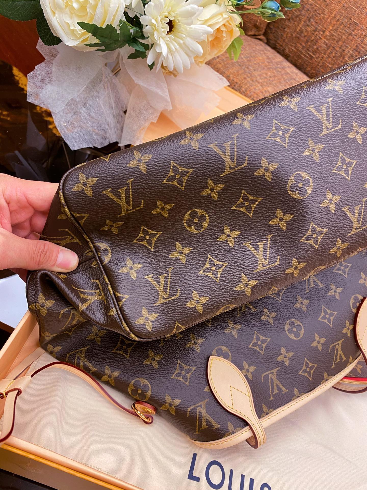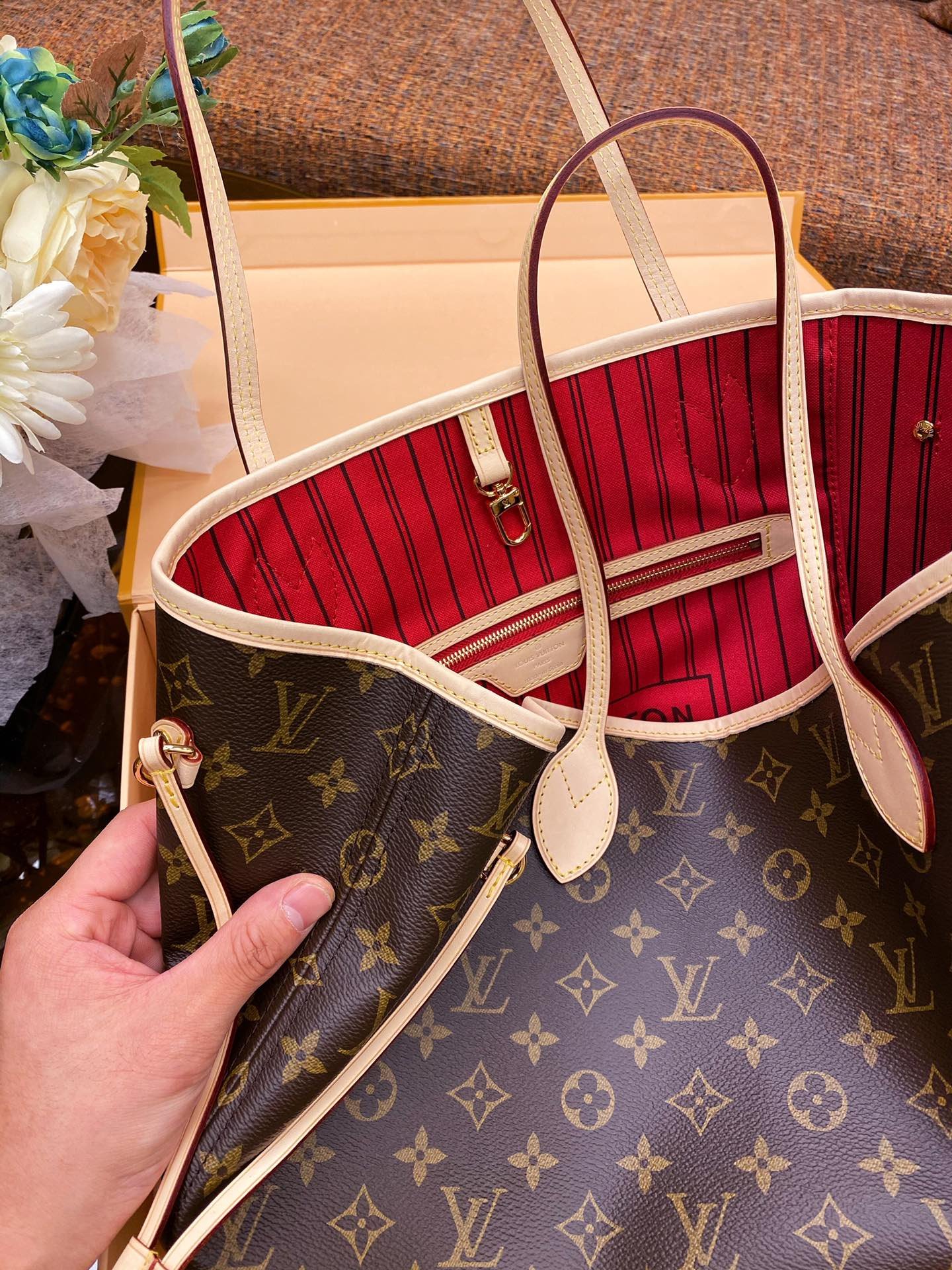 The Neverfull Medium Tote is made of soft Monogram canvas with a fabric lining and cowhide trims, creating a classic shape that is spacious yet elegant. The removable handbag can be used as a clutch or pocket, the slim handles make it easy to carry on the shoulder or elbow, and the side straps can be relaxed to transform the compact structure into a casual tote.